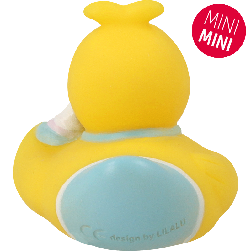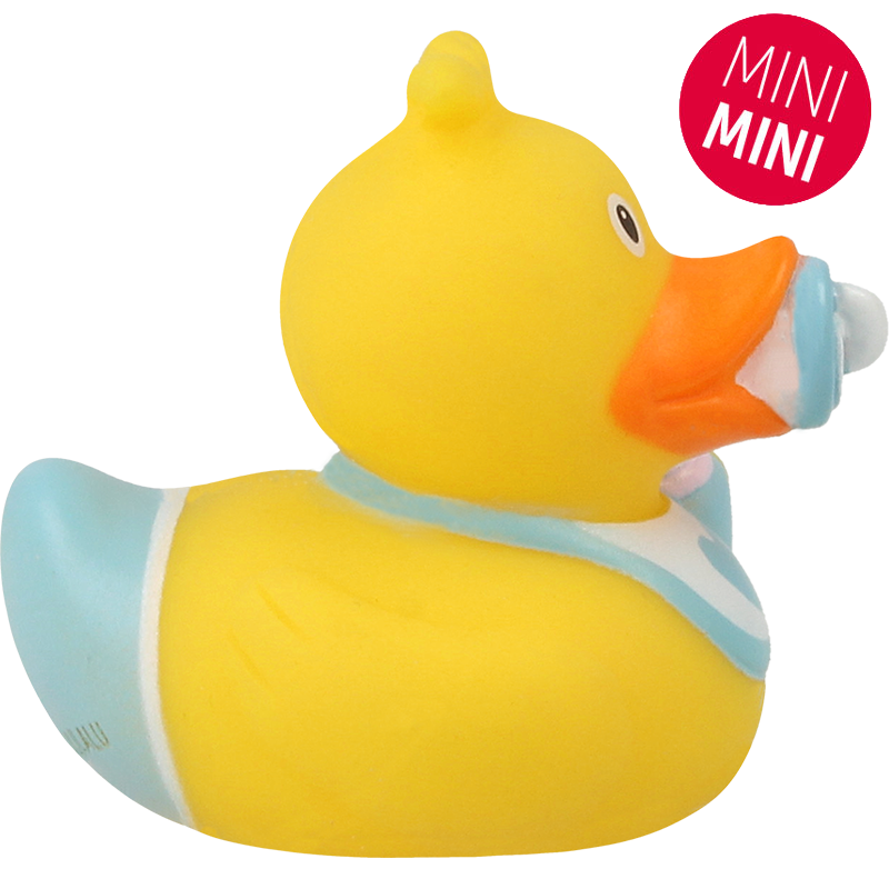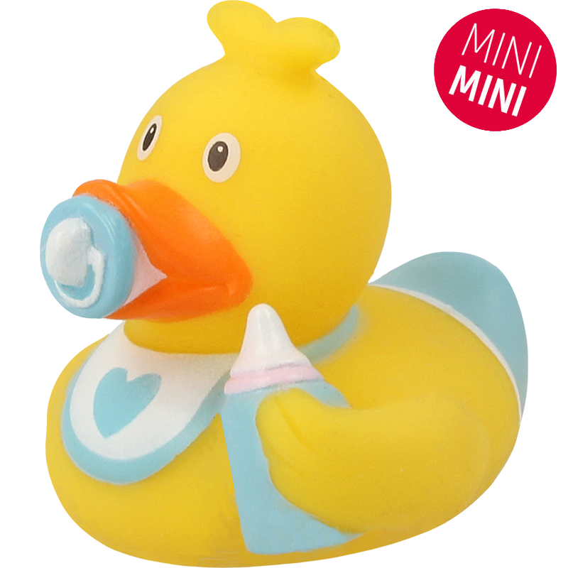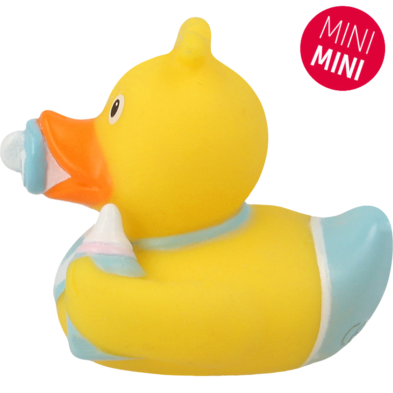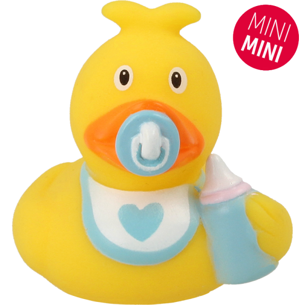 La mini paperella bebè maschietto è una dolcissima rubber duck di dimensioni ridotte 3.50 x 4.50 x 4.50 cm. Con il suo faccino carino, il ciuccio azzurro nel becco e il biberon in un’ala.