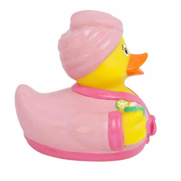 Turbante in testa, un frullato in mano e un coccoloso accappatoio fanno di questa paperella di gomma rosa l’espressione del relax. Una papera regalo perfetta in combinazione con candele, bagnoschiuma, creme o per accompagnare un buono massaggio.
