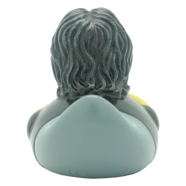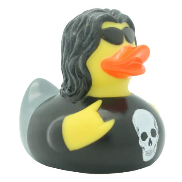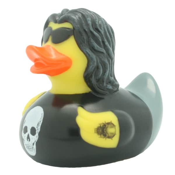 Paperella di gomma Heavy-Metal, una rubber duck dura ricca di particolari, il tatuaggio, gli occhiali scuri e la zampetta che fa il gesto delle corna. Una paperella da bagno davvero rock