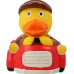 Una simpatica papera di gomma maschio al volante, con il suo cappello su un’auto decappottabile rossa scorrazza in giro per la tua vasca da bagno.