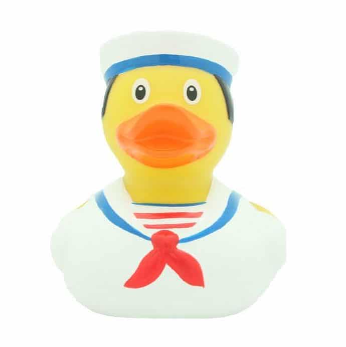 Papera di gomma marinaio, una rubber duck perfetta per tutti gli amanti del mare. Insieme a lei la paperella da bagno Capitano o la romantica papera lupo di mare.