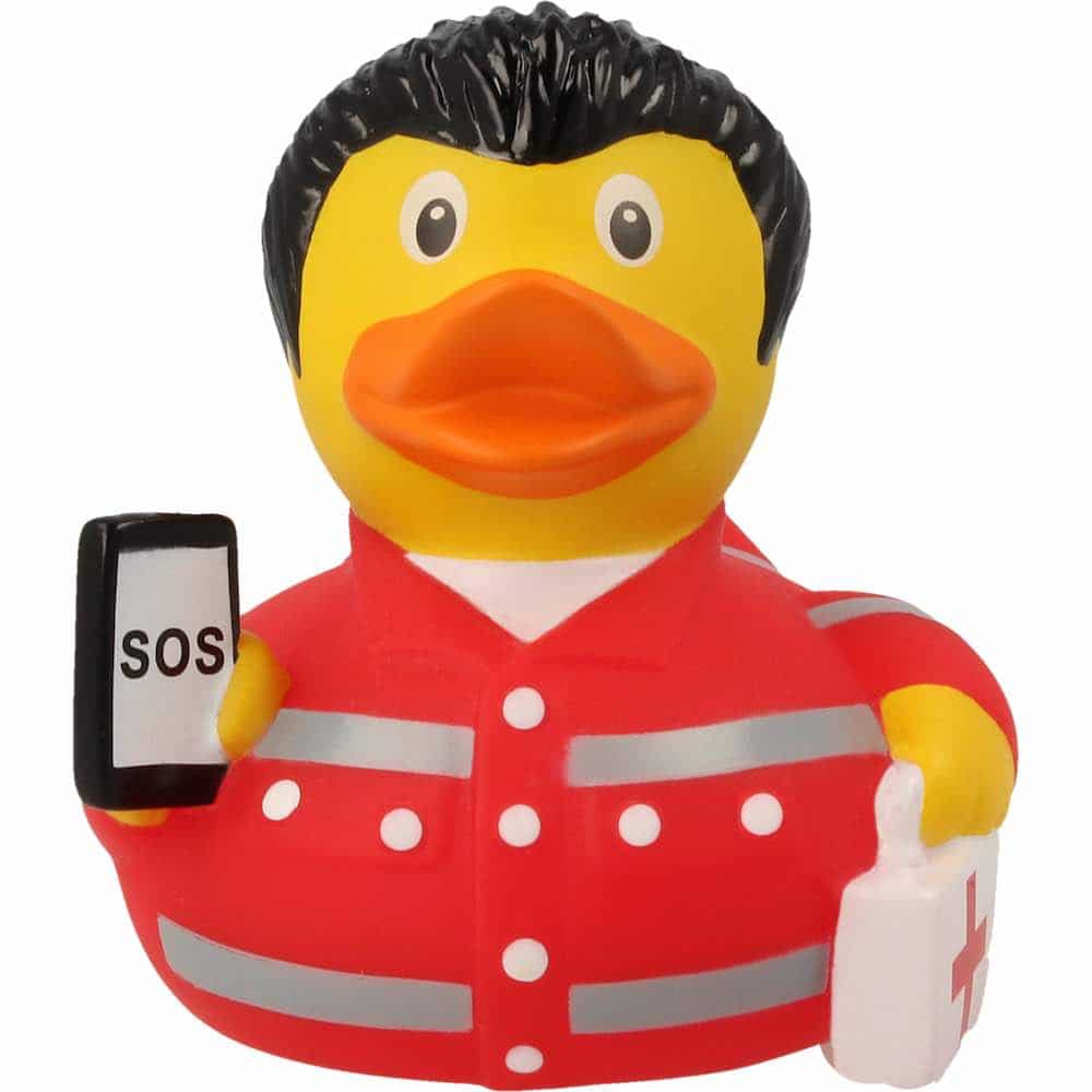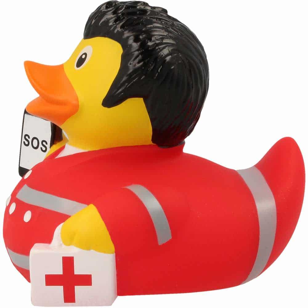 Paperella di gomma paramedico, una rubber duck davvero divertente e ricca di particolari. Con la tuta rossa, la cassetta del pronto soccorso è una paperella da bagno da collezione.